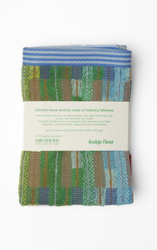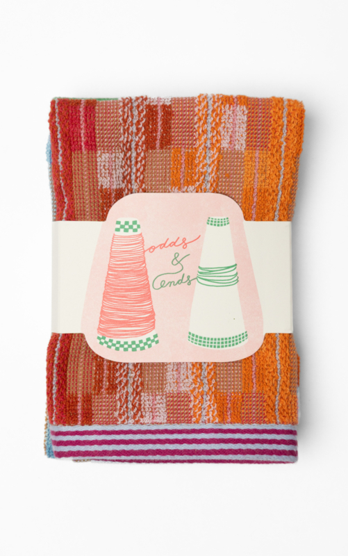 OverzichtODDS & ENDS van Foekje Fleur. Dit zijn kleurrijke multifunctionele doekjes gemaakt van industrie restanten.
